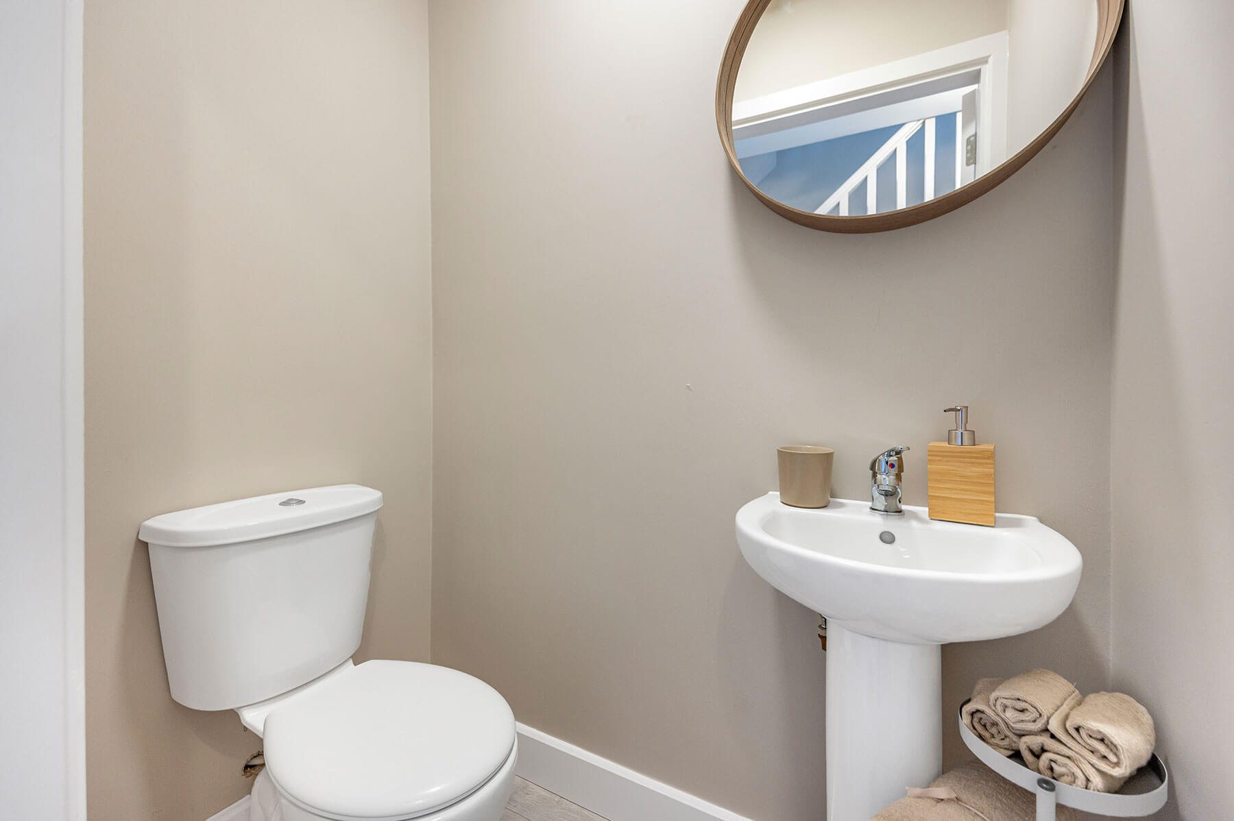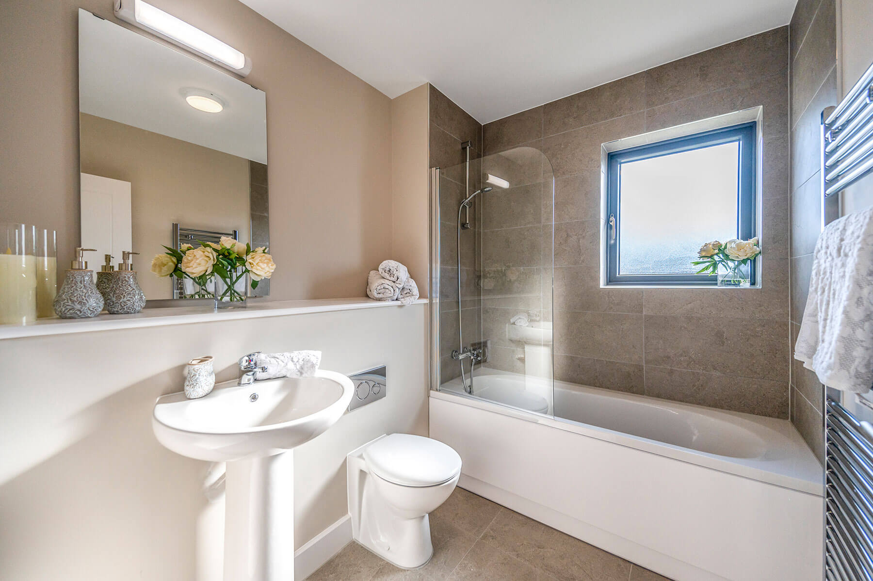 The ground-floor bathroom features close-coupled WC and full pedestal wash hand basin. Upstairs, the bathroom design boasts sleek back-to-wall WC (concealed cistern) and wallmounted wash hand basin and heated towel rail. The bath is generously sized and features wallmounted shower mixer for temperature control and excellent water pressure.